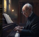 El pianista era un viejo flaco, afeitado, de cara estrecha, larga y anteojos de gruesas lentes. Vestía de negro y accionaba al hablar de una manera un tanto afeminada. Era al mismo tiempo organista de la iglesia, lo que le daba cierto aspecto eclesiástico.