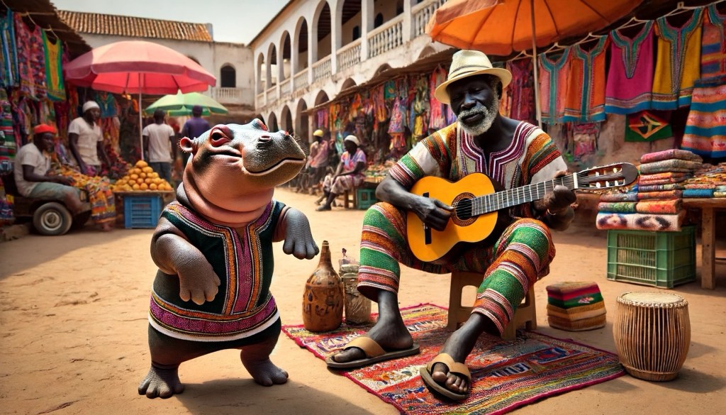 En misterios de Luanda(pág. (Agualusa, 2012, p.155), Pequeño Soba atraviesa el mercado sin prestar mucha atención a los vendedores. Se limita a sonreír, inclinando la cabeza a aquellos que lo saludaban. Papy Bolingô había comenzado el espectáculo. Fofo, el hipopótamo enano cantaba un viejo tema de la orquesta Baobab. El bar estaba lleno. Al verlo llegar, un empleado se acercó con una silla plegable. Armó la silla y el empresario se sentó. Las personas reían, fascinadas, mientras Fofo se movía acompañando el ritmo, abriendo y cerrando la enorme boca.